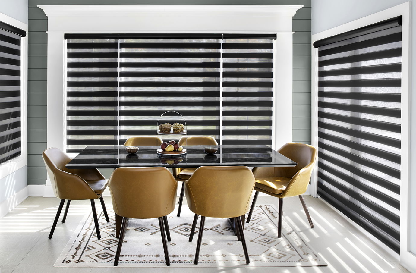 Day and night cellular shades combine two fabrics in one shade, letting you switch between light filtering and room darkening without changing products. This is all handled through a cordless system that keeps the window looking neat and uncluttered.
