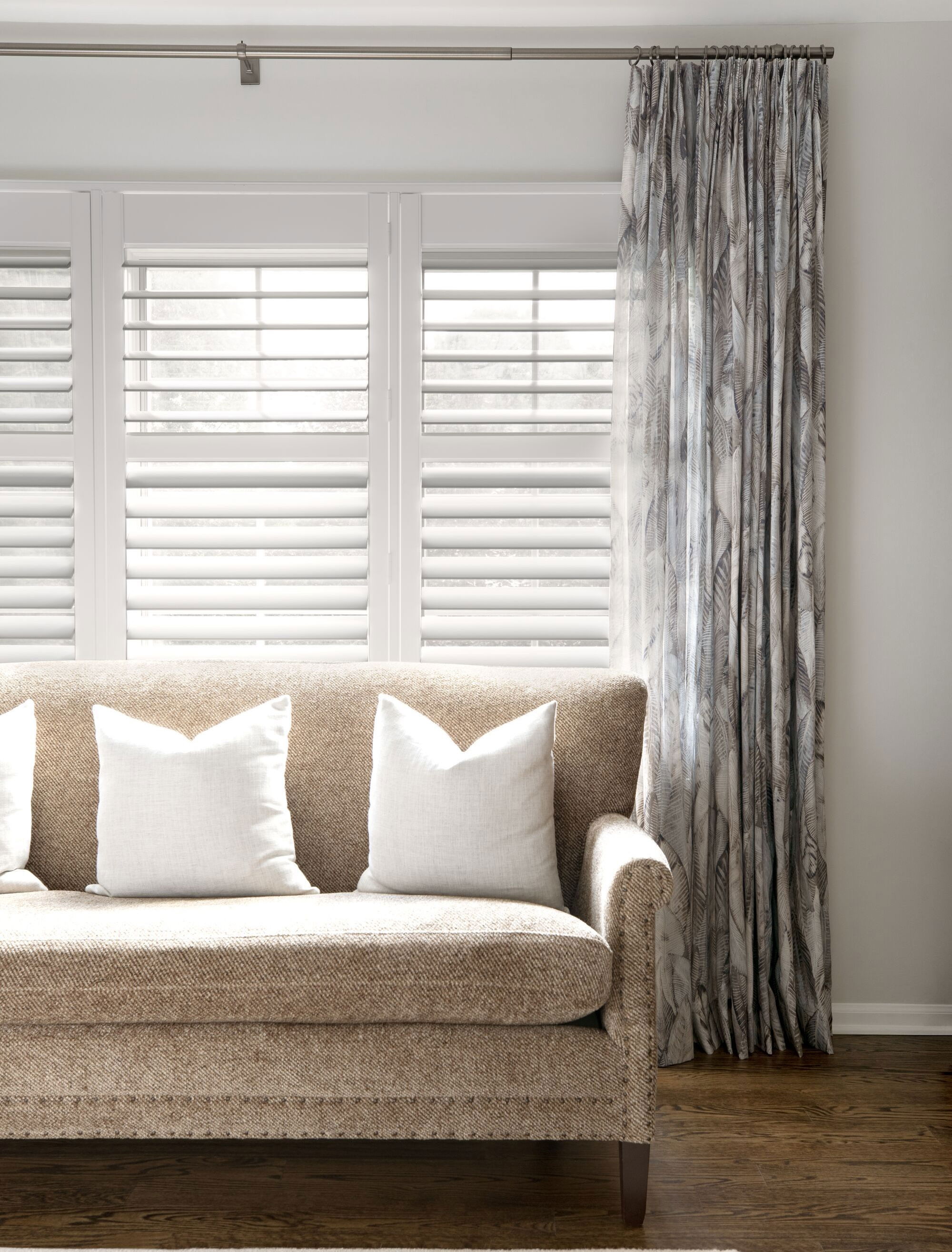 Pair full-length panels (floor to ceiling) in a tone-on-tone palette with your roller shades or faux wood blinds. This gives you flexibility as the day goes on, and control over the light you're letting into the space. And once evening rolls around you can draw the drapery for a complete, and private, look.