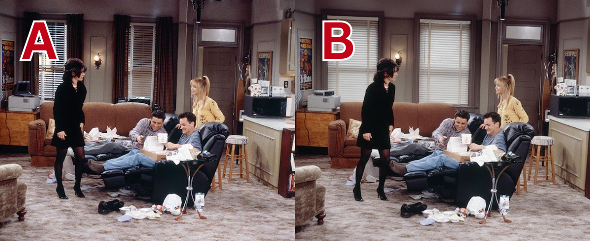 Blue Team: When it's a show you've seen so many times, like Friends, you want to be confident in your answer but honestly, we were simply not paying attention to the blinds while watching this. But we just do not think that two mid-20s guys in the 90s would be putting drapery in their windows. We're going to go B again.