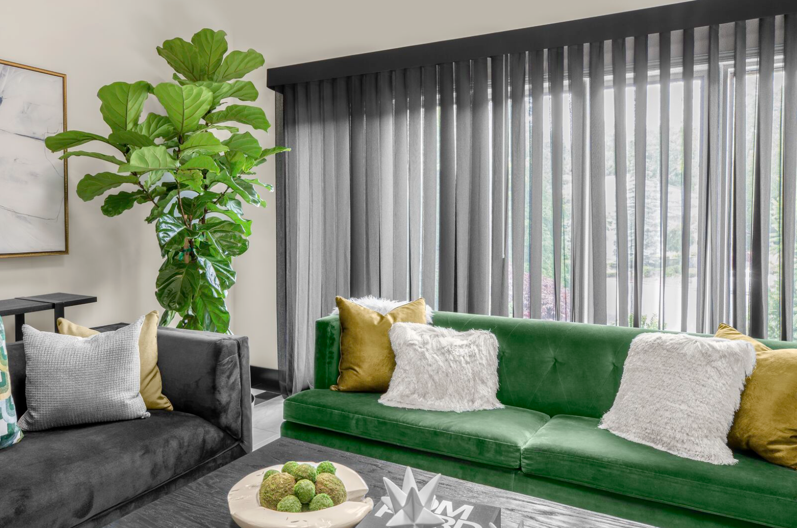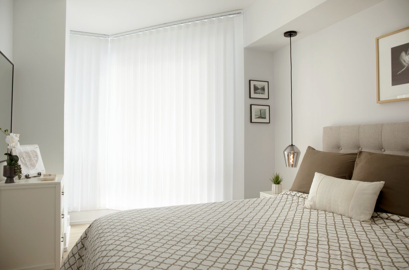 Vertical Sheer Blinds combine the light-filtering elegance of sheer curtains with the privacy and control of traditional vertical blinds. Vertical Sheer Blinds from Blinds To Go feature dual-sided vanes: one side with solid fabric for full privacy, the other with sheer material for light and visibility. Rotate the wand 180° to adjust your privacy level: solid side in for total privacy, sheer side out for daylight. Vertical Sheer Blinds combine the look of curtains with the control of blinds.