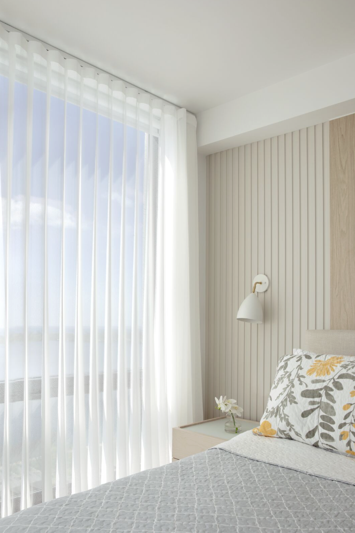 The sheer side of the Melody collection is almost transparent, allowing a high degree of light transmission while maintaining a soft visual diffusion that minimizes glare. This design ensures an open, airy atmosphere and preserves a visual connection with the exterior environment. When the vanes are rotated toward the sheer surface, daylight permeates the space evenly, enhancing brightness and spatial perception without the need for additional artificial lighting.